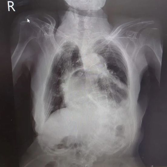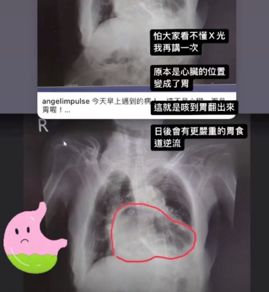 根據《ETtoday》報導,北市聯醫中興院區醫生姜冠宇透過社群平台曬出一張胸部X光片,無奈喊話:「這不是心臟,而是胃喔!」原來他早上遇到一名住在安養院的患者,因為她有胸悶、低血氧及嘔吐、食慾變差等症狀,趕緊安排就醫檢查,一照X光發現原本該是心臟的位置,竟變成了胃,甚至吃掉心臟,是典型的咳到胃翻出來的病例。