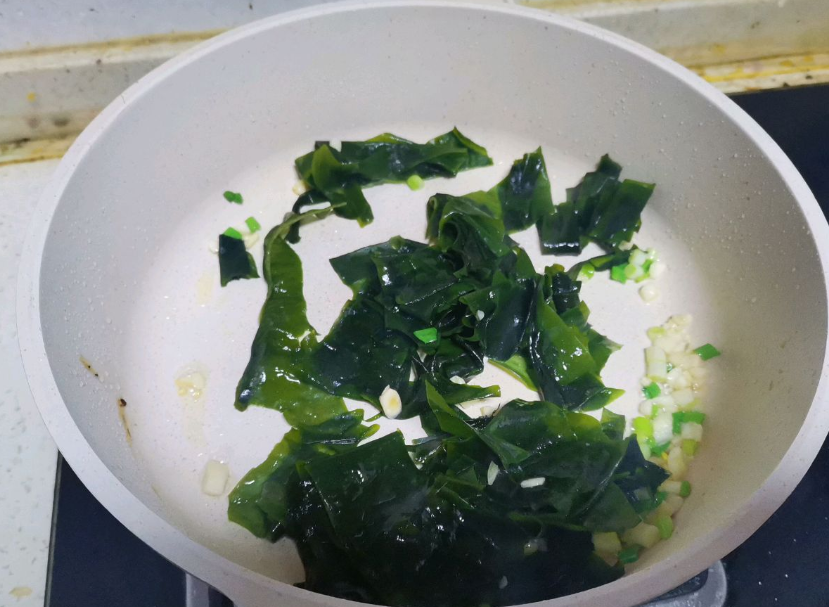 2、起鍋燒油,油熱后打入3顆雞蛋煎至金黃撈出,改刀切成塊狀。緊接著用鍋中的底油,爆香蒜末和蔥花,香味飄出后加入裙帶菜簡單翻炒一下。