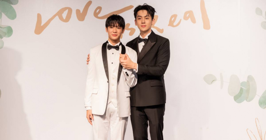 現場比照正式婚禮規格,葛兆恩與紀成澔身穿婚禮禮服登場,面對面唸出為彼此寫下的婚約誓詞,兩人唸到一半時不約而同露出緊張又甜蜜的笑容,直呼「好神奇的感覺喔!」來自馬來西亞的紀成澔難掩興奮表示:「這是我第一次在台灣參與婚禮,現場佈置彷彿回到劇中。」