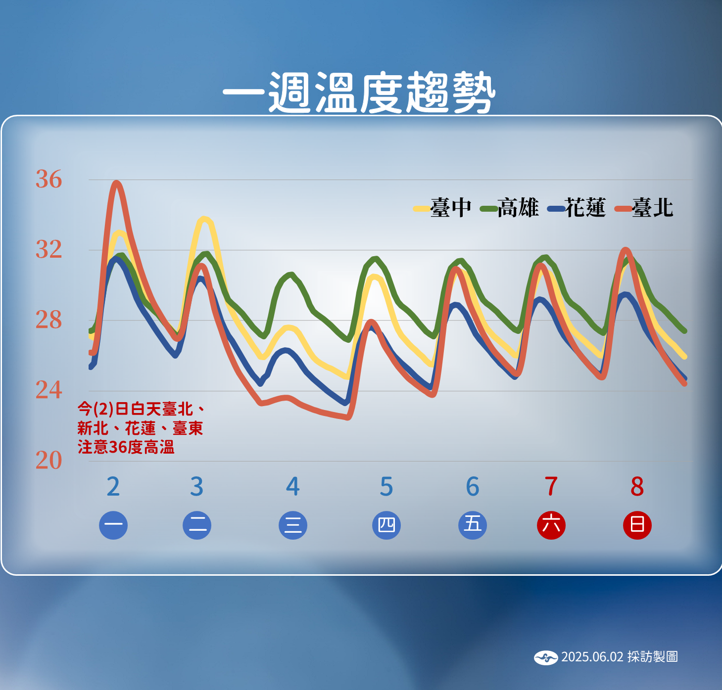 到了週三,鋒面將移動至中南台灣,中南部、東部及東南部地區將出現短暫陣雨或雷雨。北台灣則會受到東北風影響,降雨型態轉為短暫陣雨,西半部仍然有機會出現局部大雨。週四起鋒面南移至巴士海峽,中南部仍有局部陣雨或雷雨機會。展望週五到週日,全台水氣依然偏多,南部和東半部地區將持續有局部短暫陣雨,其他地區則是多雲為主,午後山區可能出現雷陣雨。