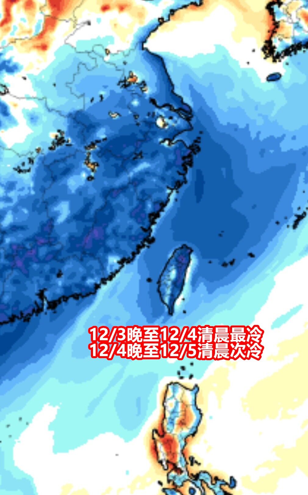 預估本週三、週四的夜間與清晨會是最寒冷的時段,北部及中部地區更將下滑至14至15度、南部15至16度、東部16至17度,離島金門與馬祖甚至只剩12至14度左右。尤其是新竹苗栗以南及空曠地帶,由於輻射冷卻作用強烈,特別容易出現低溫狀況,呈現「白天稍微回暖、夜裡轉冷、清晨最凍」的典型模式。