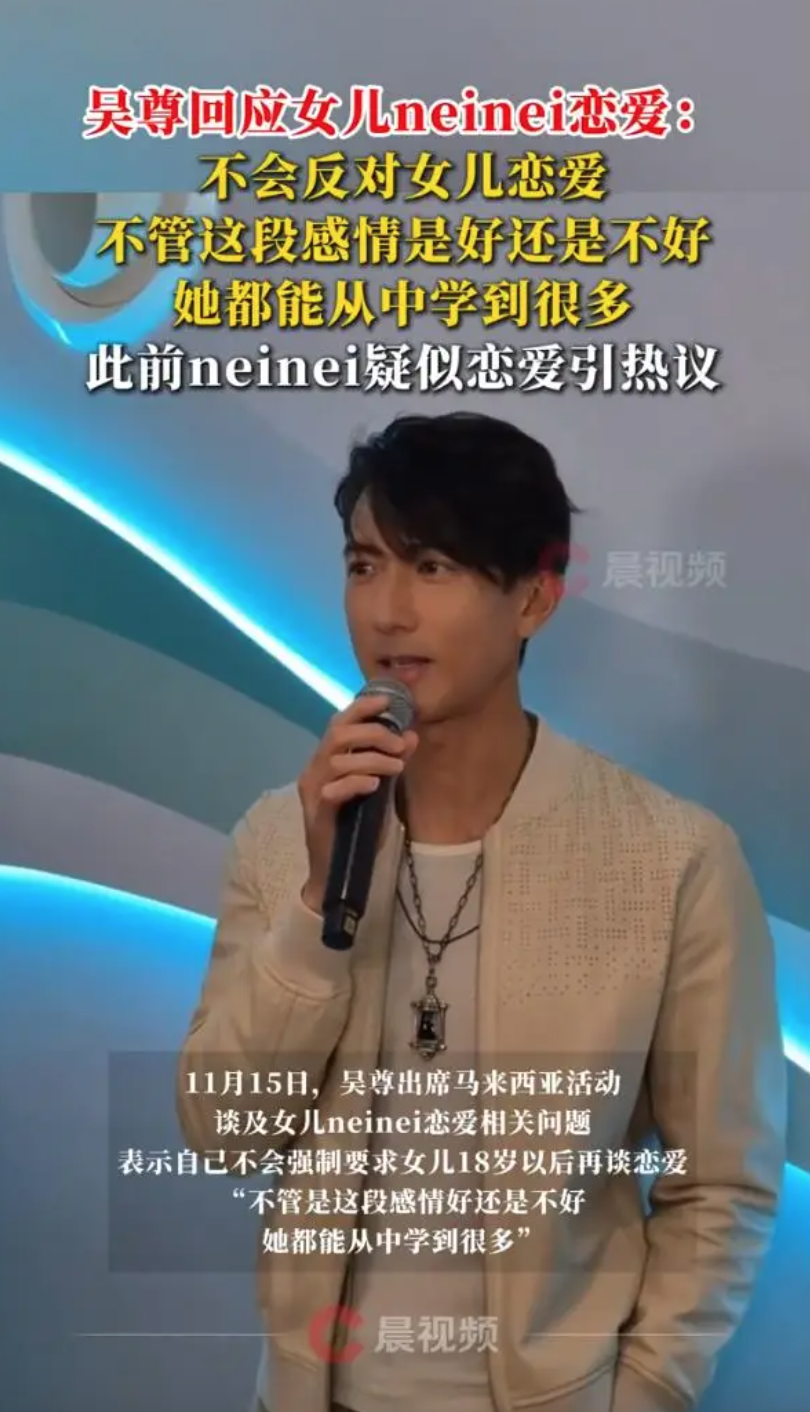 該年11月15日,吳尊在馬來西亞的一場活動中,面對女兒NeiNei接連被曝的戀愛傳聞,直接拋出一枚「重磅炸彈」──明確表示不會強制要求女兒18歲時才談戀愛,「不管是這段感情好還是不好,她都能從中學到成長經驗」,這番話瞬間在網路上掀起千層浪。